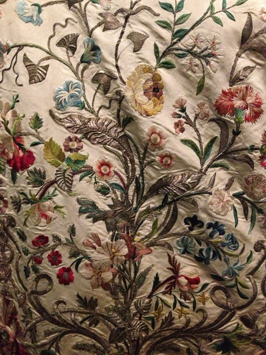 detail of the 1740s court dress consisting of a white silk mantua robe and petticoat embroidered with polychrome silks and silver threads at the Victoria & Albert Museum in London
